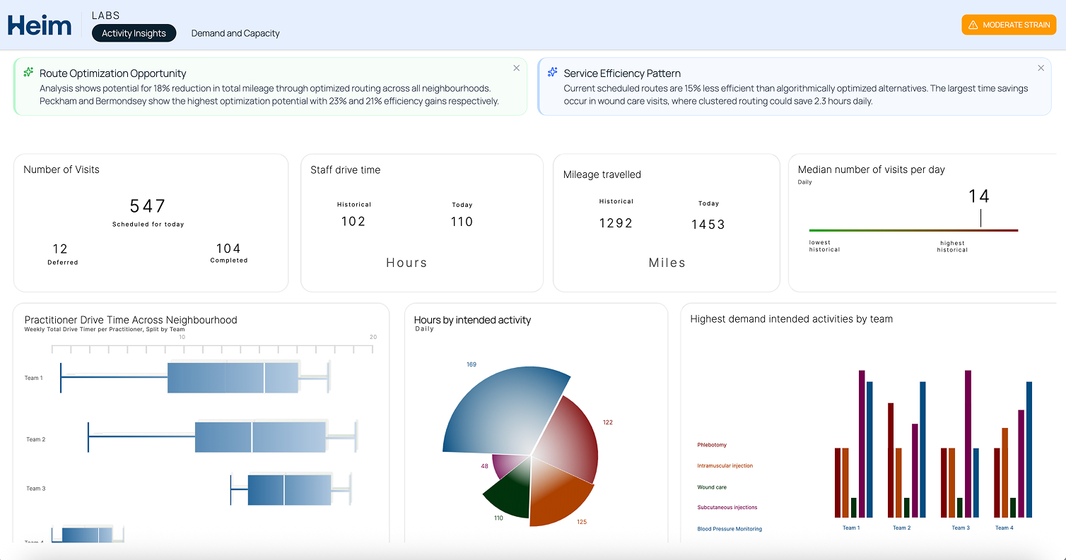 Heim Labs can help you establish the baseline utilisation levels of your community teams. We deploy our proprietary Companion App and combine this with in-depth caseload data analytics to , and deliver practical recommendations across: